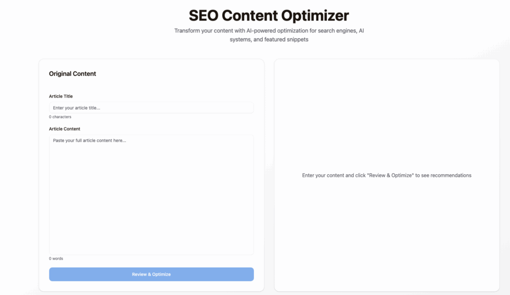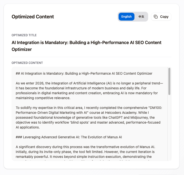 The Proof of Concept (POC) To solve this, I developed an AI SEO Content Optimizer using Manus AI. By inputting a article title and content, the system generates: