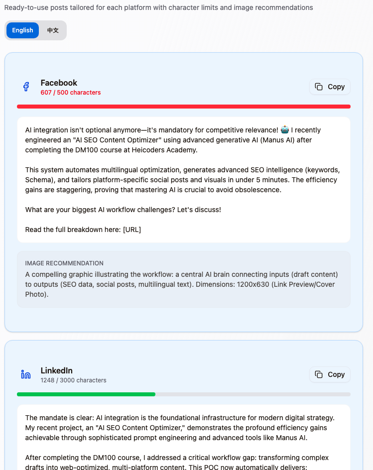 • Social Ecosystem: Tailored posts for Facebook, LinkedIn, Instagram, X, Lemon8, and Xiaohongshu.