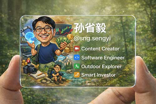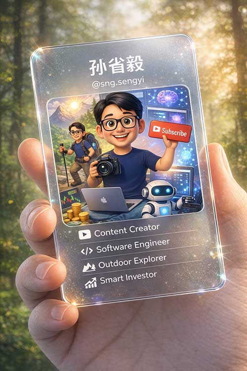 “Based on the image above (referring to your generated avatar), generate a transparent profile card with a refined design resembling a glass ID card. The card should be a rounded rectangle made of frosted glass or transparent acrylic, featuring a soft light refraction effect. The card is gently held between two fingers, with natural and realistic hand details. Display the name [Your Full Name] and the handle [@YourSocialHandle]. Include clear icons and white text indicating the roles: Content Creator, Software Engineer, Outdoor Explorer, Smart Investor. The background should be a soft-focus natural forest setting. Ensure the card content reflects the information shown above.”